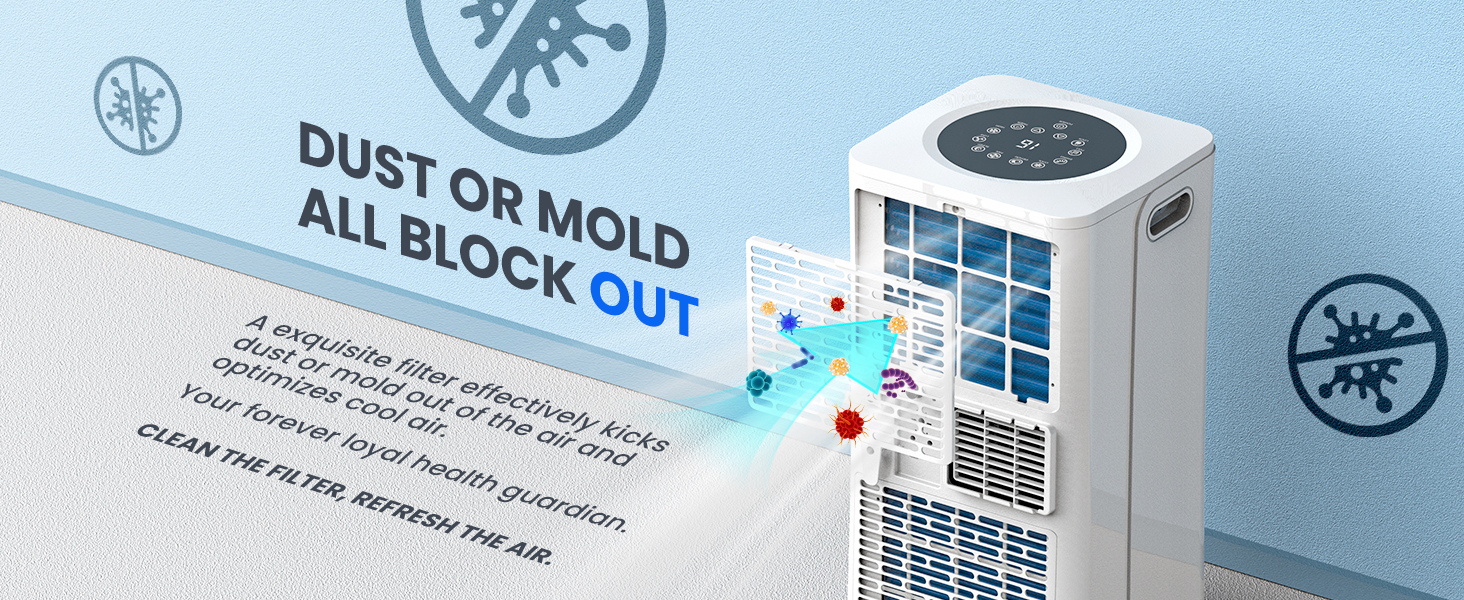 - ❄️【User-Friendly Design】Take control of your comfort with our 24h timer and versatile control options. Set your ideal temperature and mode effortlessly with our intuitive control panel or remote control. Choose startup and shutoff time to submerge yourself in cool air once getting into the room, greatly saving the energy. It is recommended to activate the child lock to keep little ones and pets safe from harm when the air conditioner is in operation. And with a washable air filter that can be washable and reused, maintenance for our air conditioner is a breeze. We recommend cleaning the air filter twice a month to ensure peak performance and cooling efficiency.