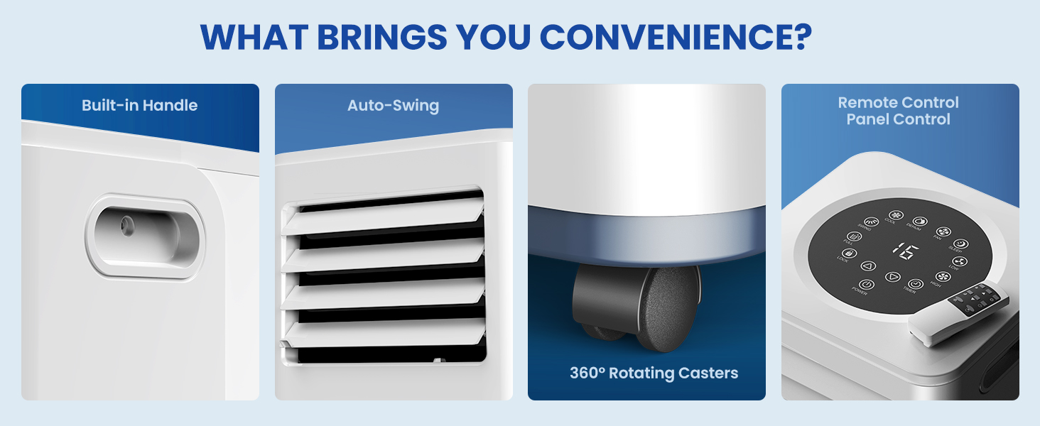 - 🆒【Smooth Move & Effortless Assembly】This air conditioner is designed with two built-in handles and four 360° casters for room-to-room mobility effortlessly in bedroom, office or in the cabin around your home. We offer window kits that are compatible with most sliding windows, catering you an effortless installment without drilling. And our unique plug design behind simplifies storage and transportation of the air conditioner.