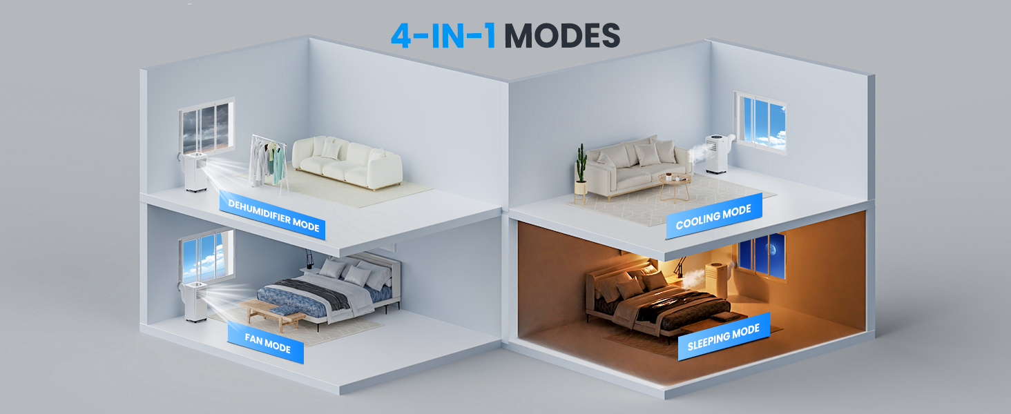 - 4️⃣【4-in-1 Multiple Functions】KGOGO air conditioner is designed specially to improve indoor air and offer year-round comfort. Beat the heat with our versatile air conditioner boasting four modes tailored for your comfort. From chilling in air conditioner mode to enjoying gentle breezes or strong cool winds in fan mode, and maintaining optimal humidity at 40%-60% RH with the dehumidifier mode ( This mode only works when the temperature is above 15℃ or the humidity is below 85% . ), and enjoying a deep ultra-quiet childlike sleep with light off and lower noise under our sleep mode, our air conditioner has you covered.