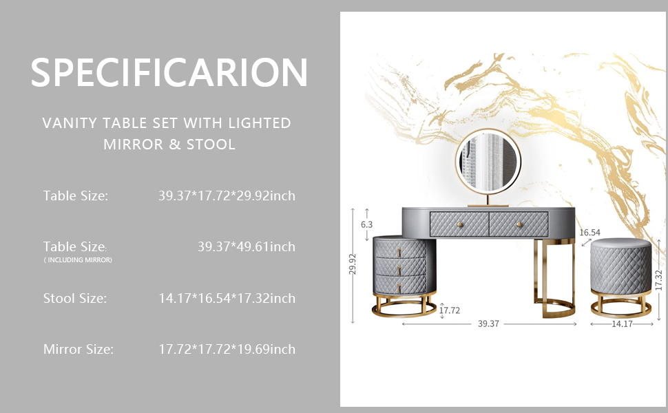 [Easy Assembly & 100% Satisfaction] Vanity makeup set includes vanity table, mirror with 3-color lights, cabinet and cushioned stool. Some assembly is required, but it's all worth it! We stand behind our product, please rest assured to buy and feel free to click "contact seller" if any questions.
