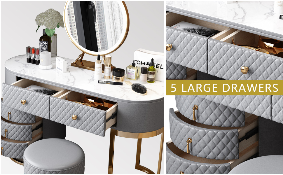 [Slate Tabletop, Solid Wood, PU Leather] The countertop is made of rock slabs and the texture runs through the entire countertop. Wear resistance, corrosion resistance, and no radiation! 100% E1-graded MDF solid wood drawers have no odor and have a longer service life. High quality craft leather, 30% more durable than others, soft and comfortable while sitting and applying your makeup.