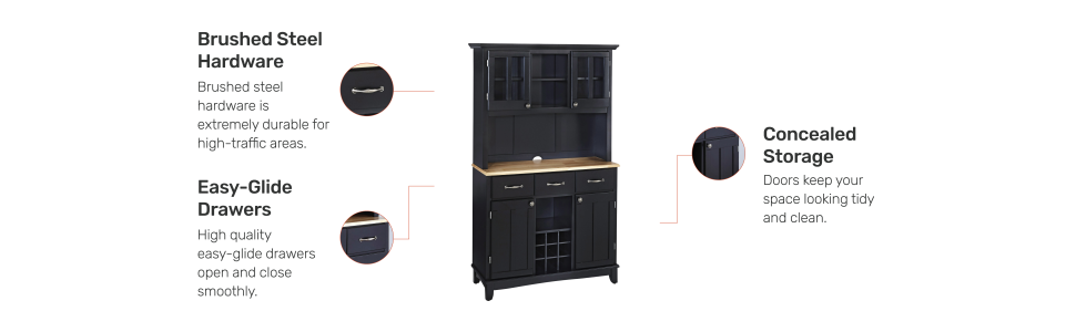 This buffet with hutch is designed to provide added storage and workspace for the kitchen and dining areas of the home